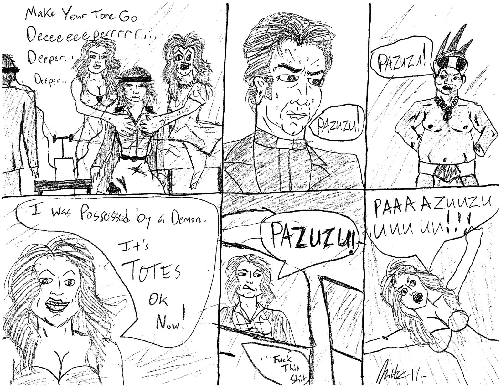 Here would be my 6 Panel Comic Style synopsis of the entirety of the plot of the seminal 1977 classic Film, Exorcist II: The Heretic starring master thespians Richard Burton and Linda Blair.