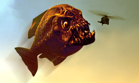 The Mega Piranha increase in size and they eat anything, including battleships and helicopters