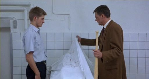 It was the gruesomeness of the atmosphere—the first time I really thought of ‘gruesome’ so particularly, not graphic, not by a stretch, not gory, just disquieting, leery with dread–that made things hum. It was the seeding of ideas—Martin shielding his eyes as he nervously walks the length of the morgue to punch the security key; the corpses in the morgue somehow being sexually violated while Martin is on the clock; the matter-of-factness of Notle saying ‘the killer takes their eyes’ almost as a tossaway line; the bodies being moved during the night in a bizarre, but seemingly purposeless, cat-and-mouse (I’ll always remember, as far back as the preview, McGregor’s delivery of the line ‘I saw her…in the hallway’ just a wonderful muted sing-song to it, as little a thing as it was I loved it, repeated it to my mirror all the time); the killer pouring a vile of semen on the buttocks of a slaughtered victim then, the camera slowly drifting from the room, moving to mount the corpse—it was the unending, pin-hole view of a particular sordidness never strayed from, every shot permeated with the same paranoiac unease, that made this film kick.