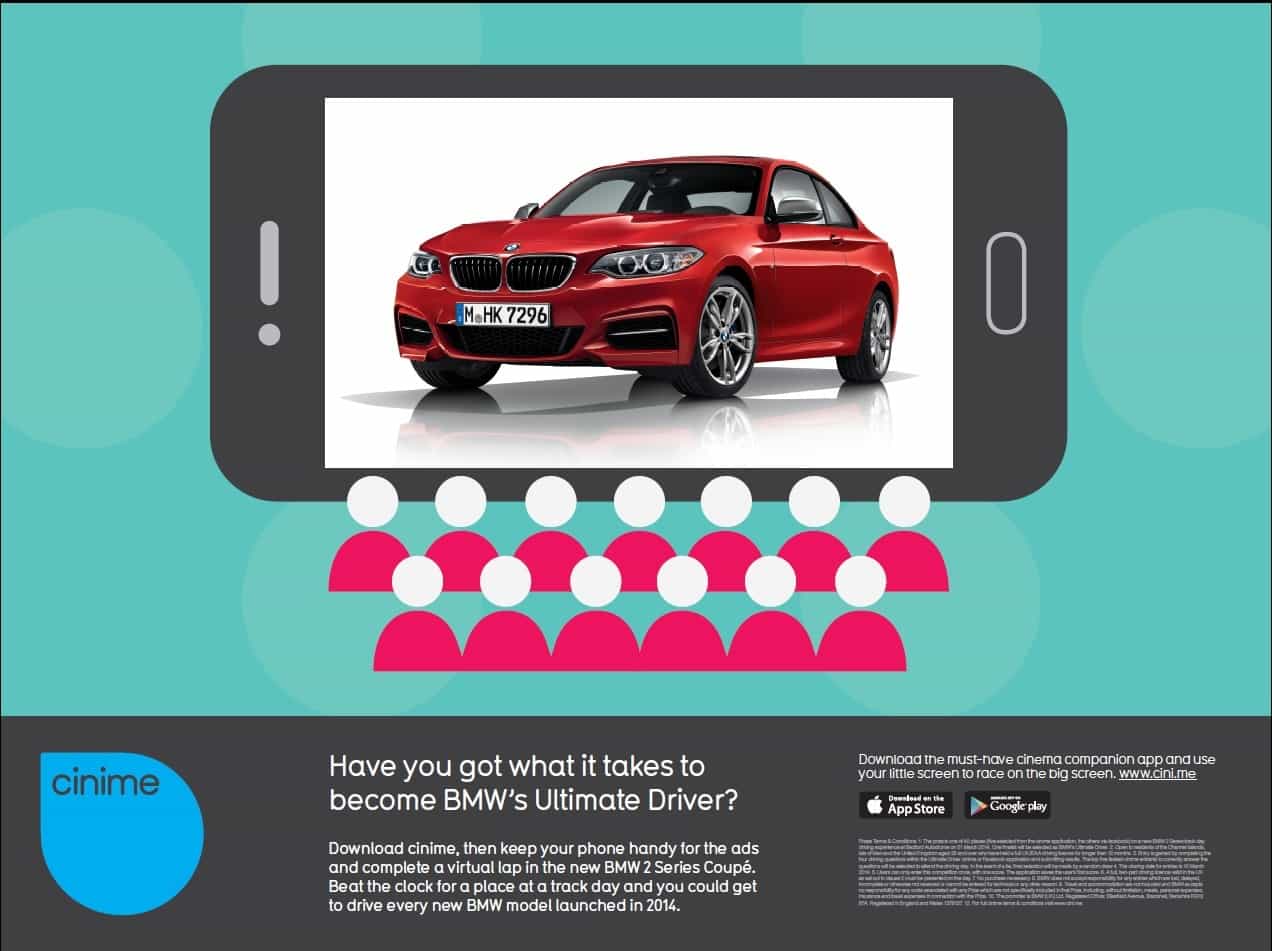 Download cinime, the new cinema companion mobile app that helps you get more from your cinema visits, and you could steer your way to become BMW’s Ultimate Driver. BMW is offering you the chance to pick the perfect line in an interactive big screen challenge. Have cinime ready on your mobile phone during the ads next time you visit an ODEON, Cineworld or Vue cinema to complete a virtual lap in a new BMW 2 Series Coupé. The fastest to choose the best driving line, breaking or acceleration points using the app will be invited to battle it out on a 2 Series track day. One person will be named BMW’s Ultimate Driver, winning the chance to test drive all new BMW models launched in 2014. And all participants will get a video of their own performance on the big screen lap, just for taking part. There are loads of other reasons to download cinime, with plenty of rewards and treats on offer including content, vouchers and prizes which can be won and unlocked every time you visit participating cinemas.